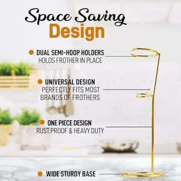 Show more If you're a coffee lover and enjoy the frothy goodness of whipped milk, our Zulay Frother Stand is a must-have addition to your kitchen. This innovative product is here to elevate your home coffee experience, allowing you to keep your milk frother within reach while ensuring it stays securely upright. The dual semi-hoop design guarantees stability, preventing any accidental spills or falls that could make a mess on your countertop.