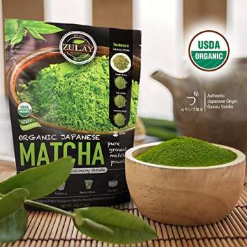 Show more Zulay Matcha Green Tea Powder is your perfect opportunity to dive into the vibrant world of matcha! This culinary-grade matcha powder is authentically sourced from the lush tea leaves of Shizuoka Prefecture, renowned for its pristine environment deep in the mountains near Mount Fuji. Enjoy the fresh scent when you open the package; it captures the essence of Japan's finest matcha. Our matcha is not just any matcha; it's packed with organic goodness and health benefits that will elevate your daily routine.