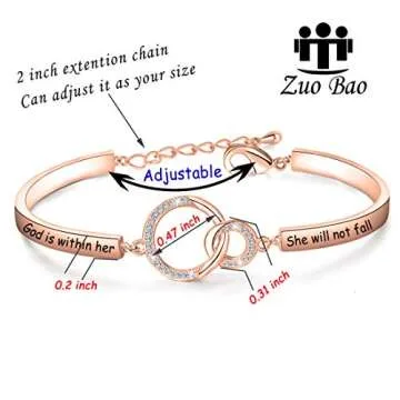Show more Introducing the exquisite Zuo Bao Christian Gift Religious Jewelry Bracelet, a truly inspiring and beautiful accessory that is more than just a piece of jewelry. Crafted from high-quality copper that is lead-free and nickel-free, this bracelet is both hypoallergenic and durable, ensuring it won’t rust, change color, or tarnish over time. Its stunning rose gold finish adds a touch of elegance that makes it perfect for any occasion while being comfortable enough for everyday wear. With a minimum diameter of 50mm (2 inches) and an adjustable extension chain of 50mm (2 inches), this bracelet fits most women’s wrists, making it an ideal gift for those who appreciate thoughtful and delicate jewelry.