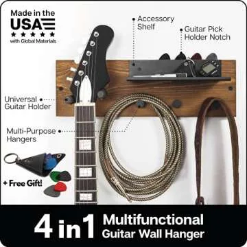 ZUR Premium Guitar Stand: Handcrafted in USA, Fits All Guitars, Top Quality Wood, Steel & Leather, Fits 16" Wall Studs Spacing, Guitar Hanger for Guitar Accessories, Guitar Pick Holder, Preassembled