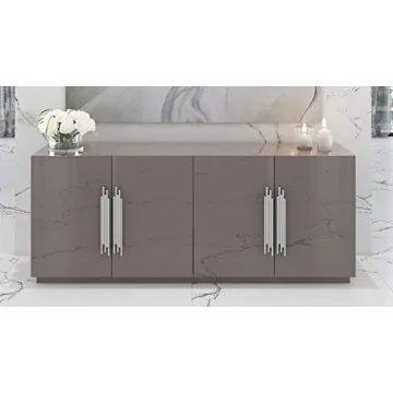 Show moreIntroducing the Zuri Furniture 78.7" Wide Modern Lurton Buffet, a stunning fusion of contemporary design and functional elegance. Finished in a sleek Gray High Gloss Lacquer, this buffet not only complements your aesthetic but also provides ample space for all your storage needs. The polished stainless steel accents add a touch of sophistication, elevating the overall appeal. Measuring W 78.7" x D 19.7" x H 31.5", it is spacious enough to serve as the centerpiece of your dining area while offering practicality with its four doors that unveil adjustable shelving for versatile storage solutions.