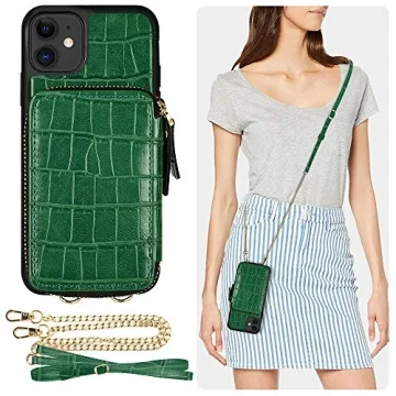 The ZVE iPhone 11 Wallet Case Crossbody is the ultimate accessory for the modern woman who values style and functionality. Crafted from high-quality leather with a stunning crocodile pattern in a deep dark green, this phone case combines luxurious aesthetics with practicality, making it a remarkable addition to your wardrobe. Designed specifically for the iPhone 11, this 6.1-inch case provides a perfect fit that protects your device while seamlessly incorporating a cardholder for your essentials....