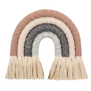 Show moreIntroducing the ZWA Rainbow Wall Hanging: This captivating piece of art is a stunning blend of creativity and craftsmanship, meticulously handmade from 100% cotton macrame rope and soft yarn. The ZWA Rainbow Wall Hanging is not just decoration; it's a vibrant expression of warmth and cheer that effortlessly enhances any space. Available in an array of sizes – from a charming 5.5 inches to a generous 14.7 inches – this wall decor is perfect for any room, be it a cozy nursery, a stylish boho-inspired room, or anywhere that could use a splash of color. The delightful colors, including soothing shades of mint green, ocher yellow, light gray, and pink, create a beautiful visual experience. Bring a touch of bohemian flair to your home with this enchanting wall hanging!