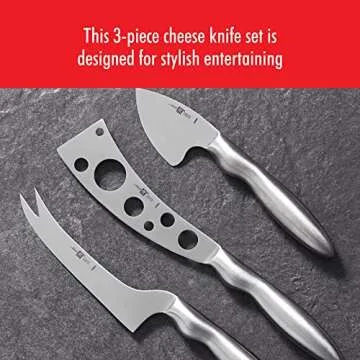 Show moreIndulge in the art of cheeseboard mastery with the exquisite ZWILLING Collection 3-piece Cheese Knife Set. This remarkable set includes three expertly crafted knives, each designed to cater to a specific type of cheese, ensuring that your cheese platters impress your guests at any gathering. The knives feature a sleek and modern ergonomic handle, made from matte-brushed stainless steel, providing both comfort and style as you slice through your favorite cheeses.