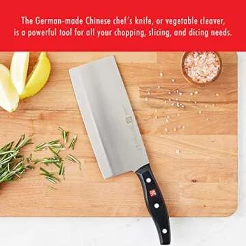 Show more Introducing the Zwilling Multi-Purpose Chef Knife, an exquisite piece of culinary craftsmanship that brings the art of cooking to a whole new level. Made in Solingen, Germany, the knife exemplifies almost 300 years of heritage in German knife-making. Engineered with precision, it features a razorsharp blade that maintains its edge longer than conventional options, thanks to its remarkable 57 Rockwell Hardness and a unique edge angle of 15 degrees per side. This knife isn't just another kitchen tool; it’s your ultimate companion in the kitchen, engineered to change the way you interact with food.