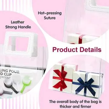 Show more Discover the perfect blend of elegance and functionality with our high-quality Clear PVC Gift Bags. Made by a trusted brand dedicated to creating exceptional gift packaging solutions, these bags are not just ordinary packaging; they are a statement of style and sophistication. Each set contains 6pcs of clear tote bags that measure 8.5 x 8.1 x 4.1 inches and feature a sturdy leather handle for easy carrying. With a thickness of 40 mil, these bags offer superior durability compared to standard options, ensuring your gifts shine on every occasion.