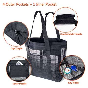 ZWOOS Large Beach Bags and Totes Bag for Women,Extra Waterproof Beach Tote Bag with Zipper & Pockets , Heavy Duty, Lightweight & Foldable ,Grocery Produce Bags Washable Mesh Shopping Bags (Black)