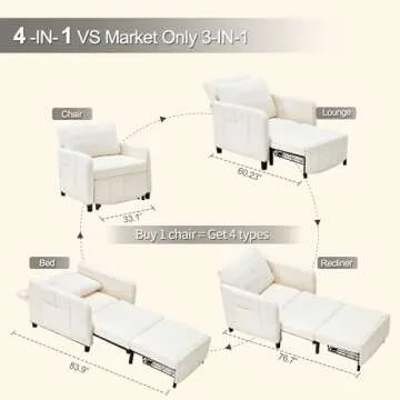 This versatile piece offers **4 functions in 1**: a sofa chair, recliner bed, lounge bed, or sofa bed. With **6 adjustable backrest angles**, you can customize your comfort level to suit any activity, whether napping, lounging, or entertaining guests. Plus, enjoy the convenience of **extra storage** and **two large side pockets** for keeping your essentials close at hand.